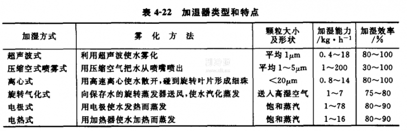 氣調庫中使用的加濕器有超聲波式、壓縮空氣噴霧式、離心式、旋轉汽化式、電極式、電熱式等多種,如表4-22所示。