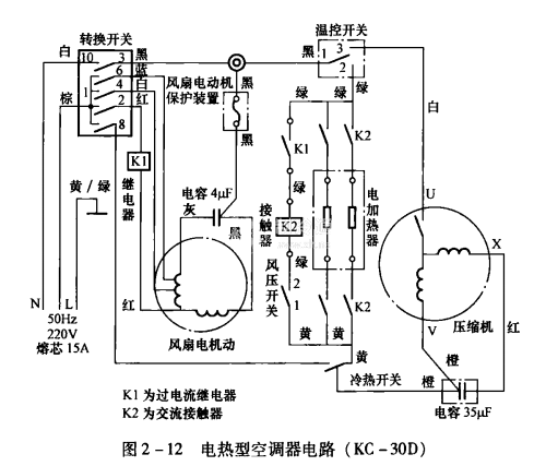 電熱型空調器的電路圖如圖212所示。電熱型空調器以往大都采用由選擇開關、繼電器一接觸器組成的控制電路,就各部分控制電路進行分析。