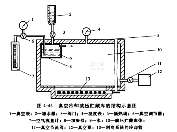 真空冷卻減壓氣調庫主要由低壓貯藏庫體、真空泵、制冷設備、加濕裝置、壓力調節裝置以及溫濕度、真空度檢測設備等組成。圖4-45為真空冷卻減壓貯藏庫結構示意圖。