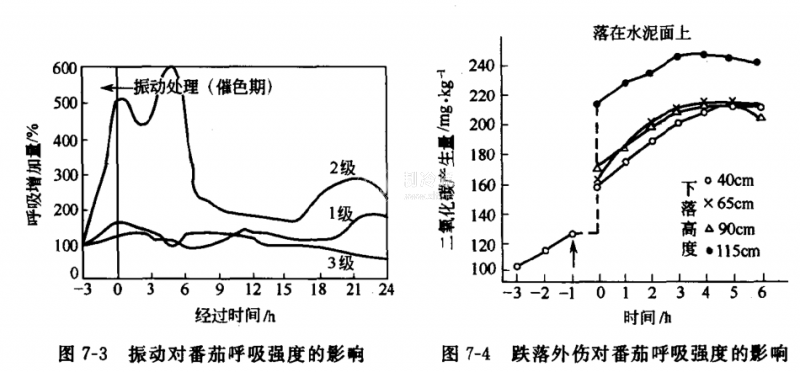 3.振動外傷與呼吸速度將果蔬往下跌落,使其產生外傷,就會立刻出現呼吸上升的現象,跌落距離越高,跌落越重,呼吸速度越大(圖7-4)。另外,果蔬在運輸中的滾動、加壓等,產生外傷,也會引起呼吸速度上升。因此,果蔬在選果、裝箱、裝車、運輸等過程中應盡量減少振動,不僅振動受傷的果蔬外觀較差,而且產生傷呼吸,使營養物質減少,風味下降。