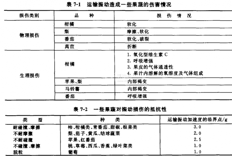 表7-1為運輸振動造成一些果蔬的傷害情況