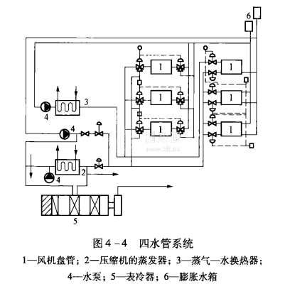 采用四水管系統,可以全年使用冷水和熱水,從而可以靈活地對空調房間的溫度進行調節。同時又避免了類似三水管系統的能量損失,使風機盤管制冷或供暖的控制更加靈活,設備的運行費用更低。但是四水管系統的初投資較大,管道占用的建筑空間較大。