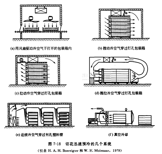 圖7-18 (b)、 (c)和((d)為幾種壓差預冷設備,它使冷空氣通過有通氣孔包裝箱進行冷卻,但均需使用標準化的打孔箱。箱內切花的排列和包裝不能阻礙冷氣流穿過箱子。
