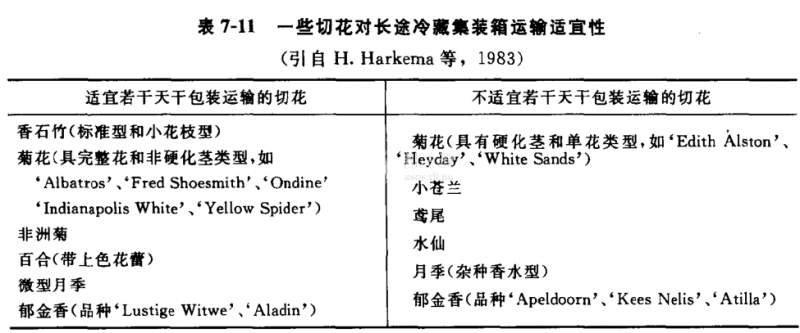 運(yùn)輸前若能用適當(dāng)?shù)?strong>花卉保鮮劑處理,并及時(shí)迅速預(yù)冷,一些切花可長時(shí)間在冷藏容器中運(yùn)枯,但有一些切花不適宜長途運(yùn)輸(表7-11)。在栽培用于遠(yuǎn)距離運(yùn)輸?shù)那谢〞r(shí),尤其要注意切花的花和葉對(duì)機(jī)械損傷、灰霉病感染、缺水和低溫傷害的抗性。