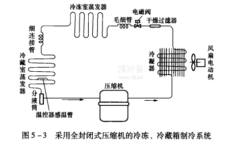 53所示為采用全封閉式壓縮機的冷凍、冷藏箱制冷系統。機組由全封閉式壓縮機、冷凝器、電磁閥、干燥過濾器、毛細管、蒸發器、分液筒等組成。