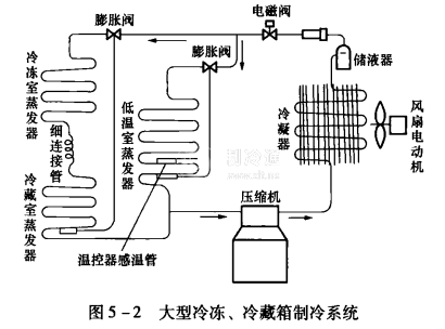 核心提示:冷凍、冷藏箱制冷系統主要由制冷壓縮機、風冷式冷凝器、儲液器、電磁閥、干燥過濾器、膨脹閥、毛細管、蒸發器等組成。圖5 -2所示為采用開啟式壓縮機組的大型冷凍、冷藏箱制冷系統。
