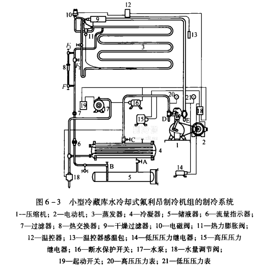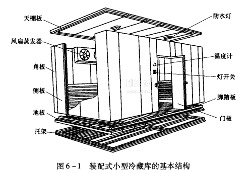 裝配式小型冷藏庫可安裝在室內或在一塊地基堅實,具有防雨、防曬的棚子下。裝配式小型冷藏庫一般配有成套的制冷系統和電器控制系統,壓縮機一般多采用半封閉式。裝配式小型冷藏庫的基本結構如圖61所示。