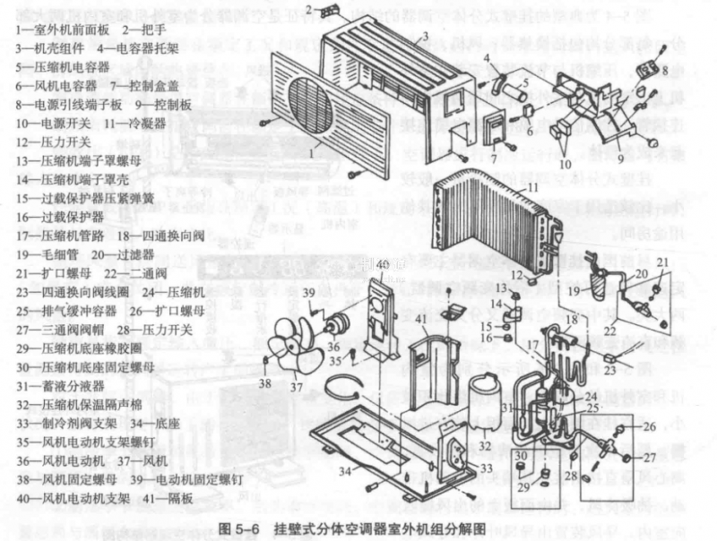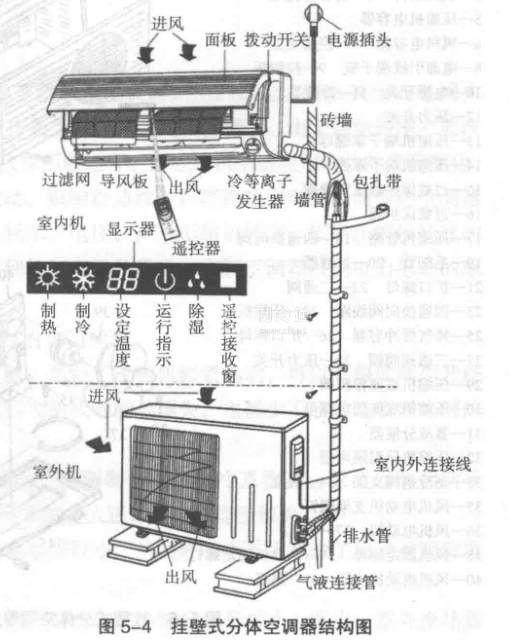 圖5-4為典型的掛壁式分體空調器的結構。其特征是空調器分為室外機和室內機兩大部分。每部分均包括換熱器、風機、控制電路等,壓縮機與節流裝置安裝在室外機上、室內機與室外機之間用兩根中間連接管了控制信號電纜和電源電纜連接起來成為整體。
