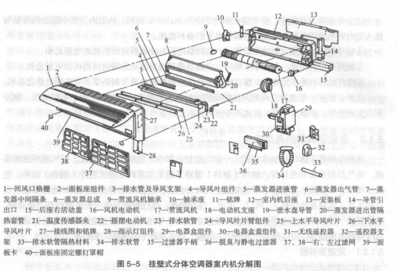 圖5-5和圖5-6所示分別為室內機和室外機的分解圖。室內機組體積較小,適宜掛在墻面上,面板上裝有進風柵,柵后依次為空氣濾清器和蒸發器。離心風扇直接由裝在其端頭的電動機帶動,抽吸冷風.并由面板上的出風柵吹向室內。導風裝置由導風葉片和導風電動機組成,它能將冷風自動地均勻送到室內各處。