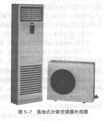 圖5-7為典型的落地分體式空調器的外觀圖,其室內機做成立柜形狀直接放置于地面,故習慣上也將其稱為柜式空調器。落地分體式空調器的基本結構與掛壁式分體空調器類似,主要的區別僅在于其室內機不是安裝在墻壁上。由此帶來室內機結構的不同。