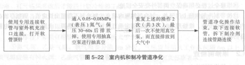 ②用惰性氣體清理循環系統,對室外機、室內機、;連接管道進行凈化(圖5-22)。