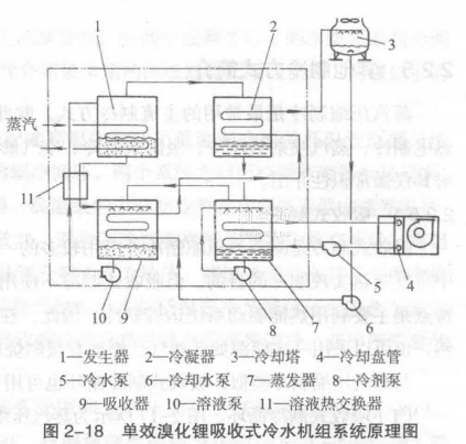 圖2-18所示為蒸汽型單效溴化鋰吸收式冷水機(jī)組系統(tǒng)原理。系統(tǒng)由制冷劑回路、吸收劑回路、熱源回路、冷卻水回路和冷凍水回路組成。圖中未標(biāo)出各回路的全部部件。