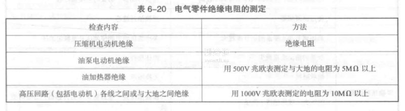 ③各電氣零件絕緣電阻的測定。測定要求見表6-20,測定工具為500V、I000V兆歐表。