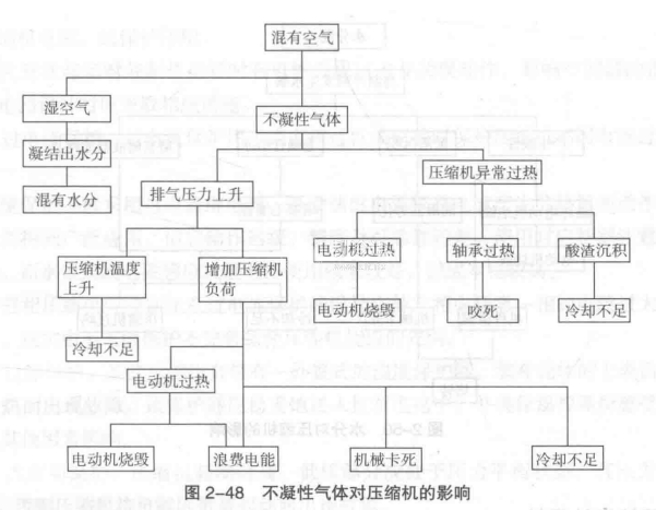不凝性氣體如空氣等增加了壓縮機的功耗和排氣溫度,而且使換熱器換熱面積減少、換熱效率下降(圖2-48)。