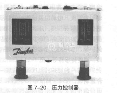 壓力控制器按工作原理可分為壓力控制器和壓差控制器兩種。當工作壓力超出控制器預先設定的壓力值時,控制器可以切斷電源停機,起到保護作用。壓力控制器主要起排氣壓力高保護、吸氣壓力低保護、中間壓力高保護、斷水保護等,壓差控制器主要用于潤滑油壓差保護和泵供液的安全保護(圖7-20)。