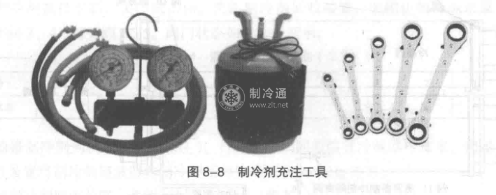 制冷劑充注所需工具一般包括制冷劑充注表具、制冷劑充注管、制冷劑儲液器加熱帶、閥門棘輪扳手等(8-8)。在選取工具時一定要檢查工具和需充注的制冷劑是否匹配,特別是在充注高壓制冷劑(R410A)時,一定要選用匹配的專用表具和充注管。