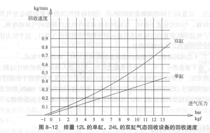 氣態(tài)回收速度較慢,適宜于少量制冷劑的回收,或者是不具備液態(tài)工藝口或制冷劑回收容器沒有氣液雙閥的情況。一般回收設(shè)備的回收速度都是一個恒定的氣體體積量,當壓力下降時,回收速度也會成倍地下降。如圖8-12所示。如對于R410A制冷劑“壓力為1.65MPa時回收速度為800g/min,而壓力為0.1 MPa時回收速度只有48.5g/min。氣態(tài)回收時回收容器的溫度上升會較快。