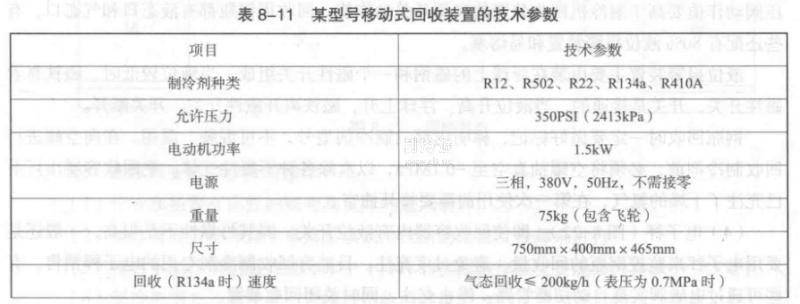 8-11所示為某型號移動式回收裝置的技術參數。