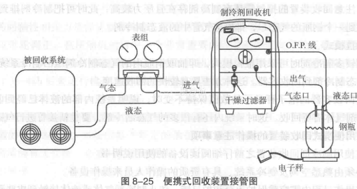 圖8-25是便攜式回收裝置的一般接管方式,也可以省掉表組,把系統的氣態或液態管直接接到回收裝置。