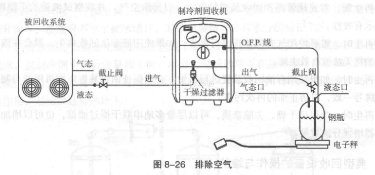 (2) 排除管路中的空氣。如圖8-26所示連接管路,先不要打開被回收系統的出氣閥,將真空泵連接到制冷劑回收裝置排氣管的截止閥處,把回收裝置置于回收狀態,開啟真空泵排除管道及回收裝置內的空氣。真空度到“0”,左右時可關閉回收裝置排氣管的截止閥,排空完成。應觀察排空完成后回收裝置壓力表有無上升,如有上升,表明有泄漏,需檢查堵漏后重新排空。