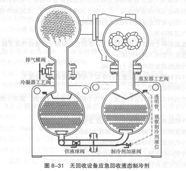 此操作適用于機組突然損壞(一般為機組蒸發器部分突然損壞),制冷劑從蒸發器側泄漏,現場無回收設備情況下(圖8-31)。但制冷機組自身需帶有隔離閥門。