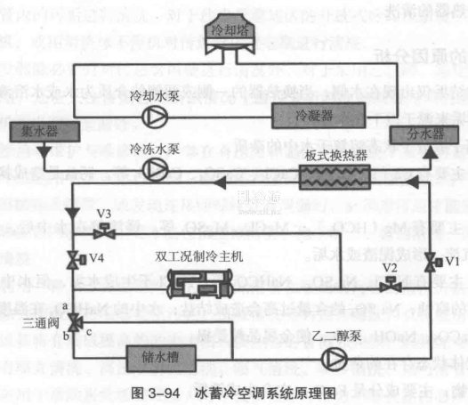 在此以采用蓄冰盤管的冰蓄冷為例(3-94)。蓄冰時,蓄冰植蓄冰盤管內為載冷劑乙二醇,蓄冰盤管外圍為水。經制冷機組冷卻的低溫乙二醉溶液進人蓄冰槽的蓄冰盤管內,與蓄冰槽內靜止狀態的水進行熱交換,并凍結成冰附著于盤管上,當最終蓄冰溫度達到-5℃,整個蓄冰設備上將形成10mm厚的冰層,達到額定蓄冰量,并通過蓄冰量傳感器通知自控系統蓄冰過程完成。