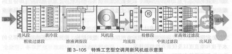 新風(fēng)機(jī)組由多個功能系統(tǒng)(段)、電氣、自動控制系統(tǒng)以及新風(fēng)箱體組成。根據(jù)不同的功能需求,可以組合不同類型的新風(fēng)機(jī)組,其功能結(jié)構(gòu)大致為:舒適型空調(diào)用新風(fēng)機(jī)組、工藝型空調(diào)用新風(fēng)機(jī)組(圖3-104)和特殊工藝型空調(diào)用新風(fēng)機(jī)組(圖3-105)三類。