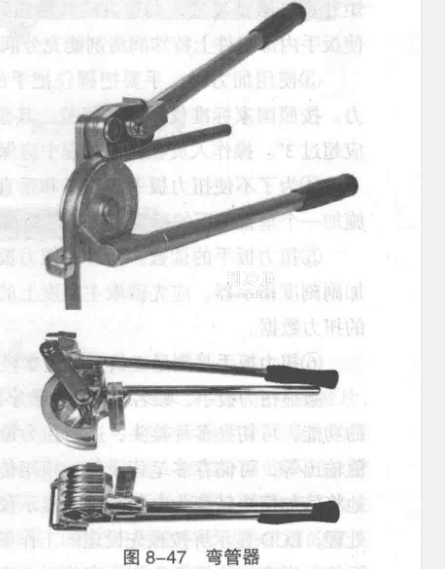 彎管器是用來改變銅管的形態,將銅管加工成所需要形狀的工具(圖8-47)。彎管器有大小多種規格,適合彎制半徑小于20mm的銅管。彎管時先將已退火的管子放入彎管工具的輪子槽溝內,扣牢管端后,慢慢旋轉桿柄,彎曲半徑應大于5倍管子外徑,彎曲時要慢而用力均勻,一直彎到所需的彎曲角度為止。然后將彎管退出模具。操作時要注意不可用力過猛,以防壓扁銅管。