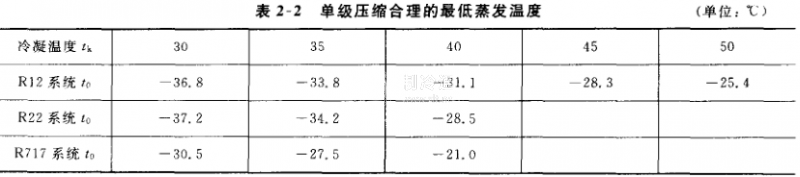 由于冷藏、生產(chǎn)及實(shí)驗(yàn)等需要,對(duì)制冷溫度要求越來(lái)越低。在單級(jí)壓縮制冷循環(huán)中,選擇適用的制冷劑,其最低的合理蒸發(fā)溫度如表2-2。