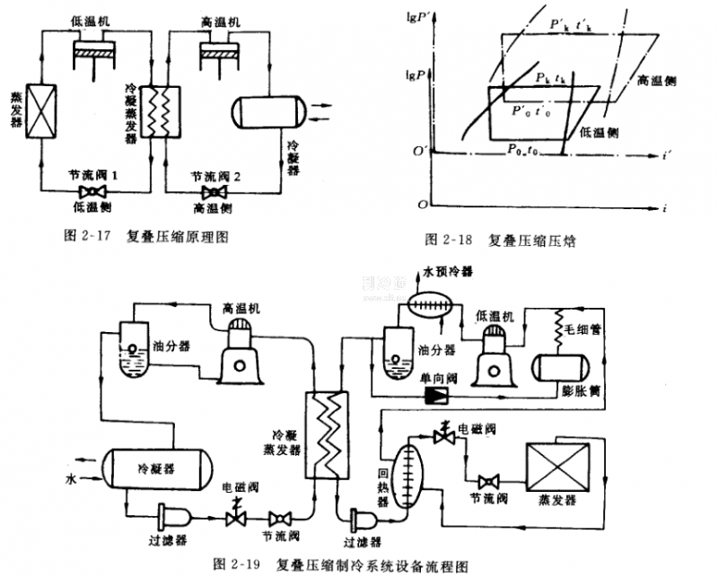 核心提示:圖2-17為復疊壓縮原理圖;圖2-18為復疊壓縮壓焓圖;圖2-19為復疊壓縮制冷系統設備流程圖。很容易看懂,復疊壓縮即兩個單級壓縮的組合。為了安全運行,在設備流程圖中,增加了一些輔助設備。