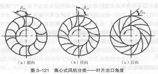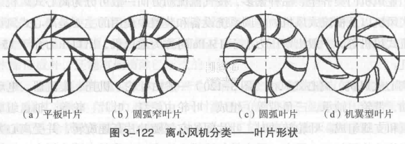 根據風量和靜壓值的要求,離心式風機還可以進一步分類,離心式風機根據葉片出口角度的不同,可分為前向風機、徑向風機以及后向風機,如圖3-121所示。按照葉片形狀可分為平板葉片、圓弧窄葉片、圓弧葉片以及機翼型葉片,如圖3-122所示。按照是否帶有蝸殼又可分為有蝸殼離心風機和無蝸殼風機。