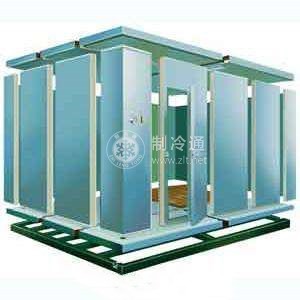 b.組合板式冷庫。這種冷庫為單層形式,庫板為鋼框架輕質預制隔熱板裝配結構,承重構件多采用薄壁型鋼材制作。庫板的內、外面板均用彩色鋼板(基材為鍍鋅鋼板),庫板的芯材為發泡硬質聚氨酯或粘貼聚苯乙烯泡沫板。由于除地面外所有構件均是按統一標準在專業工廠成套預制、在工地現場組裝,所以施工進度快,建設周期短。