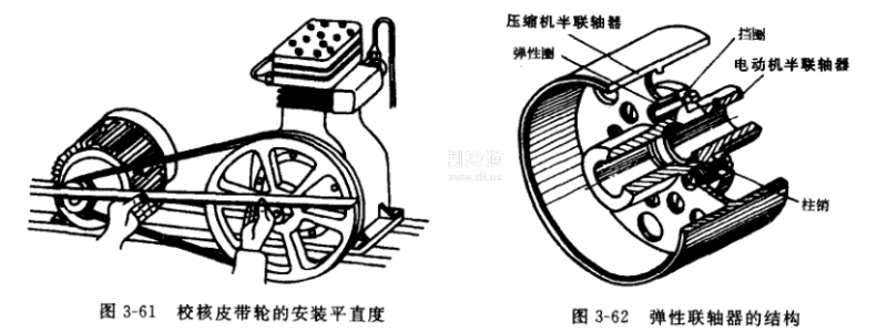 彈性聯軸器見圖3-62所示。電動機軸上裝只半聯軸器,壓縮機軸上裝只半聯軸器,中間由幾只套有彈性橡膠圈的螺栓柱銷插入相應的孔中來聯接,并傳遞力矩、緩沖減振。壓縮機半聯軸器的外圈就是壓縮機的飛輪。安裝時應保證兩半軸的同心度。如圖3-63所示,進行同心度的檢查,保證徑向偏差≤0. 3mm,角度偏差≤1°。在沒有適用的千分表時,可以用一根鐵絲代替。兩半軸之間留有適當(約幾mm)的軸向間隙.以保證軸的軸向竄動。
