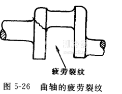 曲軸的裂紋常發生在曲柄肩上。產生裂紋的原因很多,如對曲柄肩的圓角半徑加工處理不恰當,引起應力集中;工作時軸承間隙過大,引起沖擊荷載以及曲軸彎曲;各主軸承安裝不同心而引起交變應力都能使曲軸產生裂紋,見圖5-26所示。