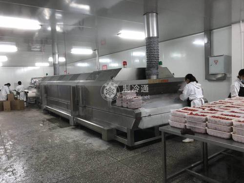 噴淋式快速凍結裝置。噴淋式快速凍結裝置是一種高效低溫凍結裝置。裝置主要分三個區段,即預冷區,噴氮區、凍結區。產品首先進入預冷區,在高速氮氣流吹沖下表層迅速凍結,而后進入噴氮區,液氮直接噴淋在產品上汽化蒸發吸收大量熱量,再進入凍結區迅速凍結到溫度中心點為-18℃,這種裝置特別適用于顆粒狀食品或調理食品如草莓、漢堡包、蝦仁、小餡餅、水煎包、香腸、臘腸等。