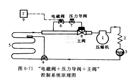 圖6-71為此種控制方式。壓力導(dǎo)閥與主閥工作原理如前所述,同時(shí),由于主閥又受電磁閥控制,只有因介質(zhì)溫度使電磁閥開啟.主閥才投入工作,若電磁閥關(guān)閉則主閥也關(guān)閉。