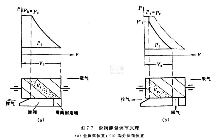 圖7-7為滑閥能最調節的原理圖。其中圖(a)為全負荷工作時的滑閥位置,此時滑閥尚未移動,工作容積中全部氣體被排出。圖(b)則為部分負荷時滑閥位置,滑閥向排氣端方向移動,旁通口開啟,壓縮過程中,工作容積內氣體在越過旁通口后才能進行壓縮過程,其余氣體未進行壓縮就通過旁通口回流至吸氣腔。這樣,排氣量就減少,起到調節能量的作用。