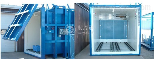 箱體前端設(shè)有安裝制冷壓縮機(jī)組、冷凝器和電控箱的框架,其支往與箱體支柱為一體;箱體后端為冷卻箱;側(cè)面設(shè)有I或2個(gè)箱門,便于果蔬進(jìn)出。箱體采用輕質(zhì)且高強(qiáng)度的鍍鋅鋼作主框架,用鋁合金桿件或鋼板壓型桿件構(gòu)成上、下側(cè)梁及箱門結(jié)構(gòu);箱內(nèi)壁、底板、頂板和門均由不銹鋼板制造;箱體六個(gè)面均采用聚氨基甲酸酯泡沫作隔熱材料。