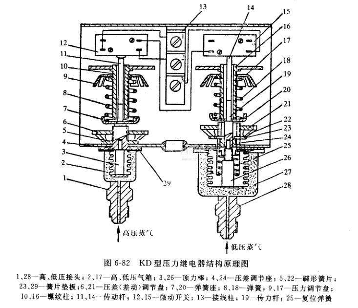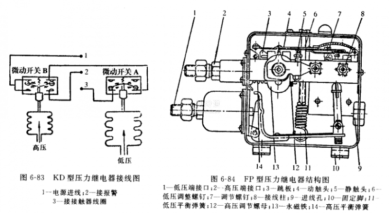 核心提示:圖6-82是KD型高低壓繼電器,即由高壓繼電器B和低壓繼電器A組合而成。圖6-83是KD型壓力繼電器的接線圖。圖6-84為FP型壓力繼電器。