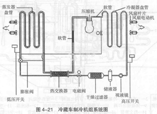 機械式冷藏汽車的制冷機組一般均采用蒸汽壓縮式制冷機組,可分為整體式機組和分體式機組,其特點類似于鐵路機械冷藏車。制冷系統由制冷壓縮機、冷凝器、膨脹閥和蒸發器等基本部件組成(4-21)。