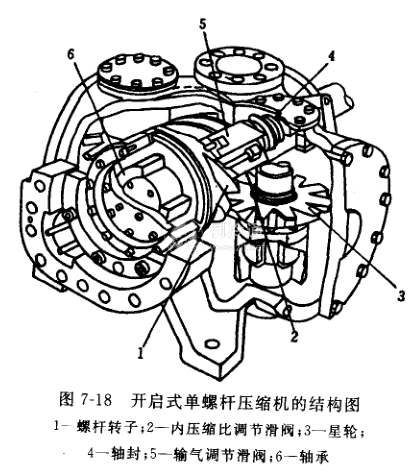 單螺桿壓縮機與雙螺桿不同,在轉子兩側對稱配置的星輪分別構成雙工作腔,各自完成吸氣、壓縮和排氣過程,所以單螺桿式壓縮機的一個基元容積在轉子旋轉一周內完成了兩次吸氣、壓縮和排氣循環。