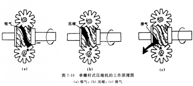 開啟式單螺桿壓縮機的結構如圖7-18所示。圖中由螺桿轉子1的齒間凹槽、星輪3和氣缸內壁組成一獨立的基元容積,猶如往復式壓縮機的氣缸,轉動的星輪齒片作為活塞,隨著轉子和星輪不斷轉動.基元容積的大小發生周期性的變化,其工作過程如圖7-19所示。圖7-19(a)是吸氣過程。陰影齒槽表示制冷劑已充滿該基元容積,這時,該基元容積的轉子齒槽吸氣端進氣口與吸氣腔相通,并且處于吸氣即將終了狀態。當螺桿轉子繼續旋轉時,封閉著的星輪的齒片與轉子齒槽相嚙合,隔開吸氣腔,吸氣結束。圖7-19(b)是壓縮過程,隨著轉子旋轉,基元容積被迫向排氣端推移(或稱密封的接觸線向排氣端推移),陰影的基元容積連續縮小,氣體被壓縮而壓力提高,直至基元容積與排氣口接通為止。在壓縮過程中噴入一定量的潤滑油,以達到密封、冷卻和潤滑等目的。圖7-19(c)是排氣過程,其陰影部分基元容積同徑向和袖向排氣孔口相通,此時,錢子旋轉,基元容積繼續變小,但里面氣體壓力不會提高,僅僅把氣體送到排氣管道,直至容積中氣體排盡為止。