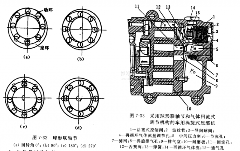 在渦旋式壓縮機(jī)中只允許渦旋轉(zhuǎn)子繞渦旋定子以偏心距e公轉(zhuǎn),不能自轉(zhuǎn)。為此在機(jī)構(gòu)上必須設(shè)有防自轉(zhuǎn)機(jī)構(gòu)。一般常用的有十字聯(lián)軸環(huán)(圖7-27)和球形聯(lián)軸節(jié)。球形聯(lián)軸節(jié)(圖7-32)是由兩塊幾何參數(shù)完全相同的環(huán)形孔板,以一定的偏心距。,將鋼球卡嵌其中組合而成,其中一塊為動環(huán),固定在渦旋轉(zhuǎn)子的背側(cè),而另一塊為定環(huán),固定在機(jī)座上保持不動,使渦旋轉(zhuǎn)子可作偏心距。的平移轉(zhuǎn)動運(yùn)動。球形聯(lián)軸節(jié)不僅具有防自轉(zhuǎn)的作用,同時還可兼有平衡軸向力的止推作用。圖7-33所示為一裝有球形聯(lián)軸節(jié)的車用空調(diào)渦旋式壓縮機(jī)。