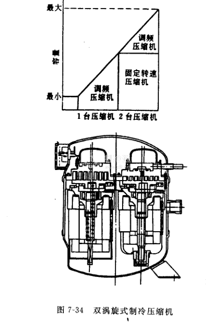 在這方面,值得一提的是日本東芝公司所開發(fā)的雙渦旋式壓縮機(jī)。雙渦旋式壓縮機(jī)是將兩個(gè)渦旋式壓縮機(jī)封裝在同一個(gè)機(jī)殼中,其中一個(gè)為常規(guī)的固定轉(zhuǎn)速的渦旋式壓縮機(jī)。另一個(gè)為可以進(jìn)行調(diào)頻無級(jí)調(diào)速的渦旋式壓縮機(jī)(圖7-34)。此機(jī)是根據(jù)大樓超級(jí)多聯(lián)空調(diào)機(jī)的需要而研制的。這是因?yàn)槎嗦?lián)機(jī)具有很長(zhǎng)的管道,壓頭要求高,系統(tǒng)分支多。這就需要大大增大制冷劑和潤(rùn)滑油量,將兩個(gè)渦旋式壓縮機(jī)并置在同一機(jī)殼中,則在機(jī)殼中所允許貯存的制冷劑和潤(rùn)滑油量可以增大以保證壓縮機(jī)運(yùn)行的更大可靠性,此機(jī)的特點(diǎn)有:功率范圍為0.75-7. 5kW,可實(shí)現(xiàn)無級(jí)調(diào)節(jié)(見圖7-34上圖)。部分負(fù)荷效率下降少;用于熱泵中在低環(huán)境溫度下的供熱量下降少。