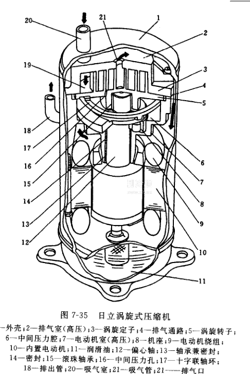 圖7-29所示的美國谷輪渦旋式壓縮機的潤滑系統是依靠曲軸旋轉時的離心力抽吸,將潤滑油輸送到各潤滑部位,此時壓縮機、電動機是處在低壓殼體中,因此也有一種利用吸排氣壓差來供油的潤滑系統(圖7-35),壓縮機通過渦旋定子中心孔21排氣,氣體越過渦旋定子3,經由壓縮機和殼體間的缺口通道,流向電動機側。由于氣流速度減慢,使氣體中含油分離,并通過焊于亮體內壁的油捕集網使油進一步分離。與此同時排氣也冷卻了電動機。這樣壓縮機、電動機處在高壓殼體中,在殼體底部油池中的潤滑油在壓力差的作用下,通過濾網、曲軸中心的油孔,將油送到各潤滑點。