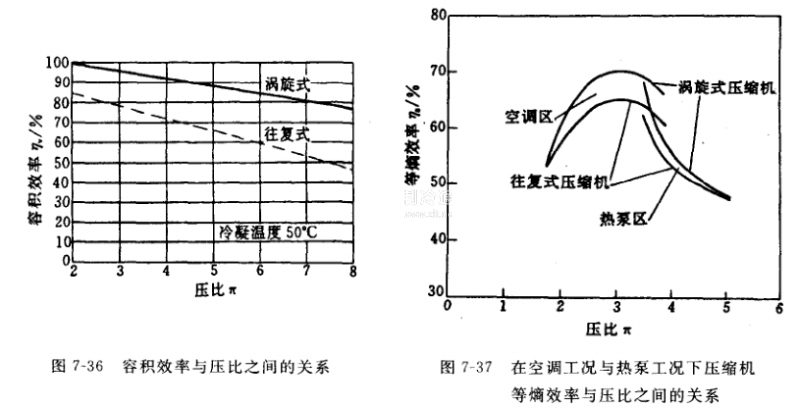 渦旋式壓縮機由于吸氣及壓縮過程緩慢,氣體的流動損失較小,因此在空調工況和熱泵工況具有比往復式壓縮機較高的等墑效率(圖7-37)。