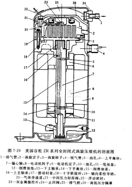 全封閉壓縮機而言,減少對吸氣的加熱是很重要的,吸氣被加熱會減少制冷劑的質量流量及排氣溫度的升高。在空調和熱泵中,吸氣溫度梅增加31意味著質量流量和效率下降1%以上,在全封閉式壓縮機中,最大的熱源就是電動機。在12kW左右的制冷壓縮機中,僅電動機發出的熱量,就可使吸氣溫度升高11℃。為此在渦旋式壓縮機中采用電動機定子與壓縮機的機殼做成緊配合,使殼體成為定子的散熱面,這樣可以將電動機產生的熱量的20%由殼體導出。此外為了冷卻電動機.在主軸上開有油孔,引導油在離心力的作用下通過油孔510甩向定子兩端線圈,并在下部設有油盤11(見圖7-29),使油再次甩向定子下端線圈,以便更好地冷卻電動機。