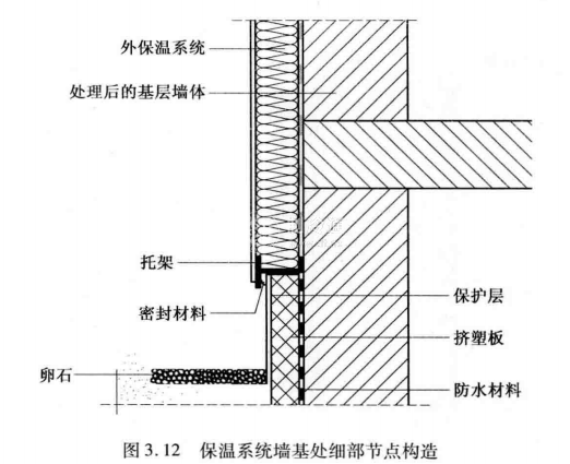 國內的外保溫工程通常是將保溫板貼至墻根,并把涂料刷至與地面交接處。建筑物墻基處的外保溢系統由于沒有采用必要的防護措施,保溫層一旦破壞,外保溫系統的耐久性就會降低。解決辦法是,在墻基離地約30mm處增加托架系統,以提高整個外墻保溫系統的穩定性和耐久性。墻基處及地下部分用擠塑聚苯板進行保溫處理,同時采用防水砂漿、鋁板或混凝土板做保護層,提高外保溫系統墻基處的保溫防水能力,也可以在外保溫墻面墻根處,鋪設一層30~50 cm寬,20 cm深的卵石層,對外保溫系統起到防濺水保護作用。保溫系統墻基處細部節點構造如圖3.12所示。