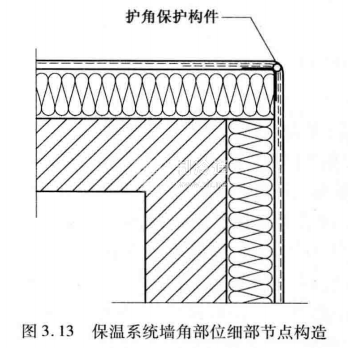 外保溫工程墻角處,比較容易受到磕碰而破壞,而且一旦損壞不易修復。可以考慮在外墻拐角處使用帶網格布的護角條進行保護,既可以簡化施工,又可增強外保溫系統中墻角處的抗沖擊能力。保溫系統墻角部位細部節點構造如圖3.13所示。
