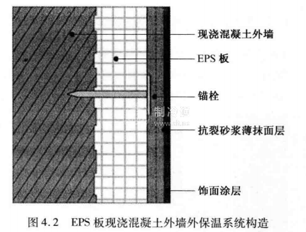 EPS板現澆棍凝土外墻外保溫系統以現澆混凝土外墻作為基層,EPS板為保溫層, EPS板內表面(與現澆混凝土接觸的表面)沿水平方向有矩形齒槽。內外表面均涂滿界面砂漿,在施工時將EPS板置于外模板內側,并安裝錨栓作為輔助固定件,澆灌混凝漿薄抹面層,外表以涂料為飾面層。EPS板現澆混凝土外墻外保溫系統構造如圖4.2所示。